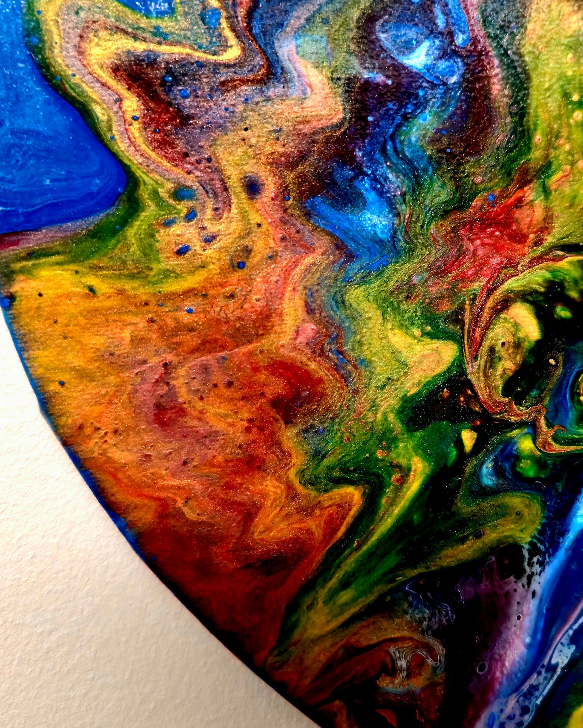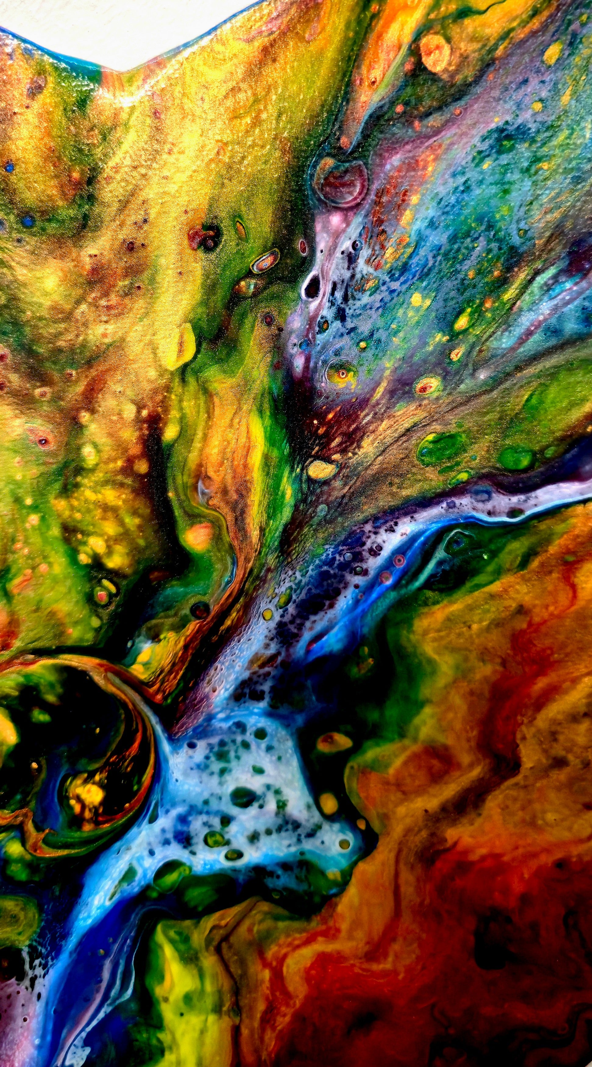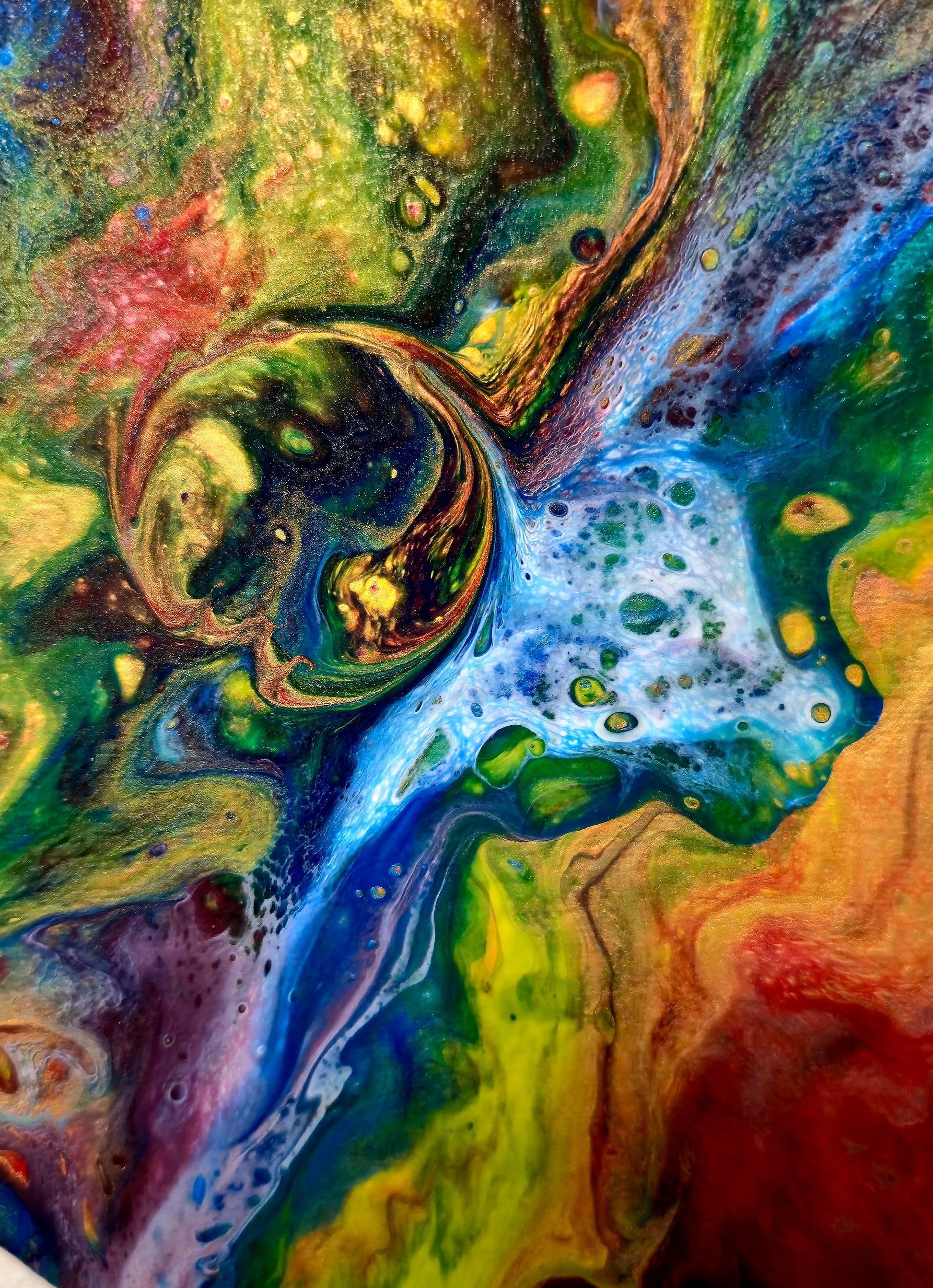 Farby akrylowe swobodnie spływają po płótnie, tworząc niepowtarzalne struktury i przejścia kolorystyczne. Każdy obraz jest absolutnym unikatem – niemożliwym do odtworzenia, namalowanym raz, na zawsze.