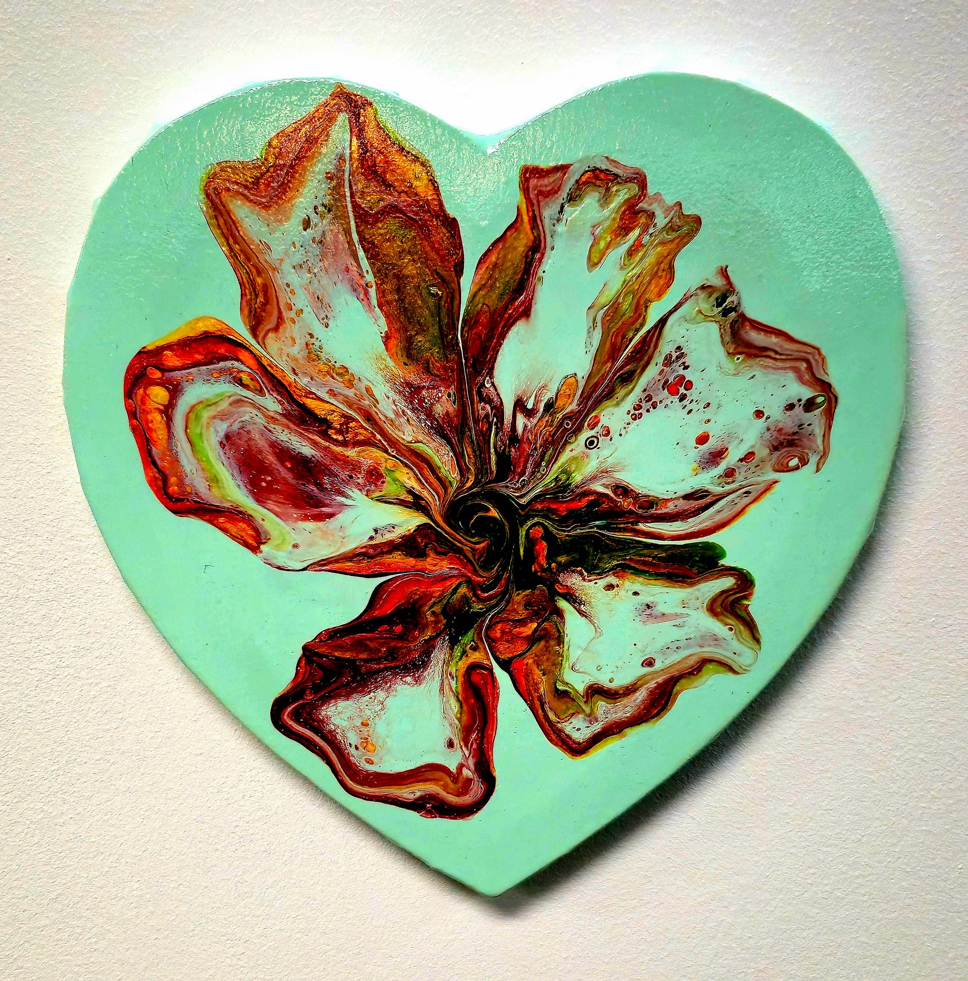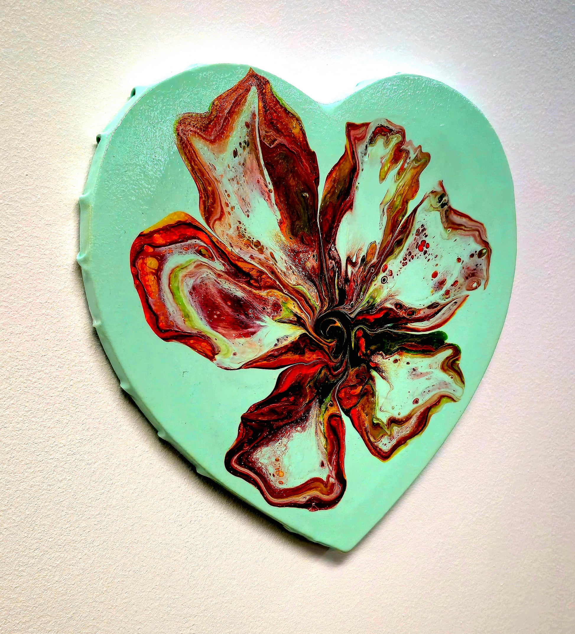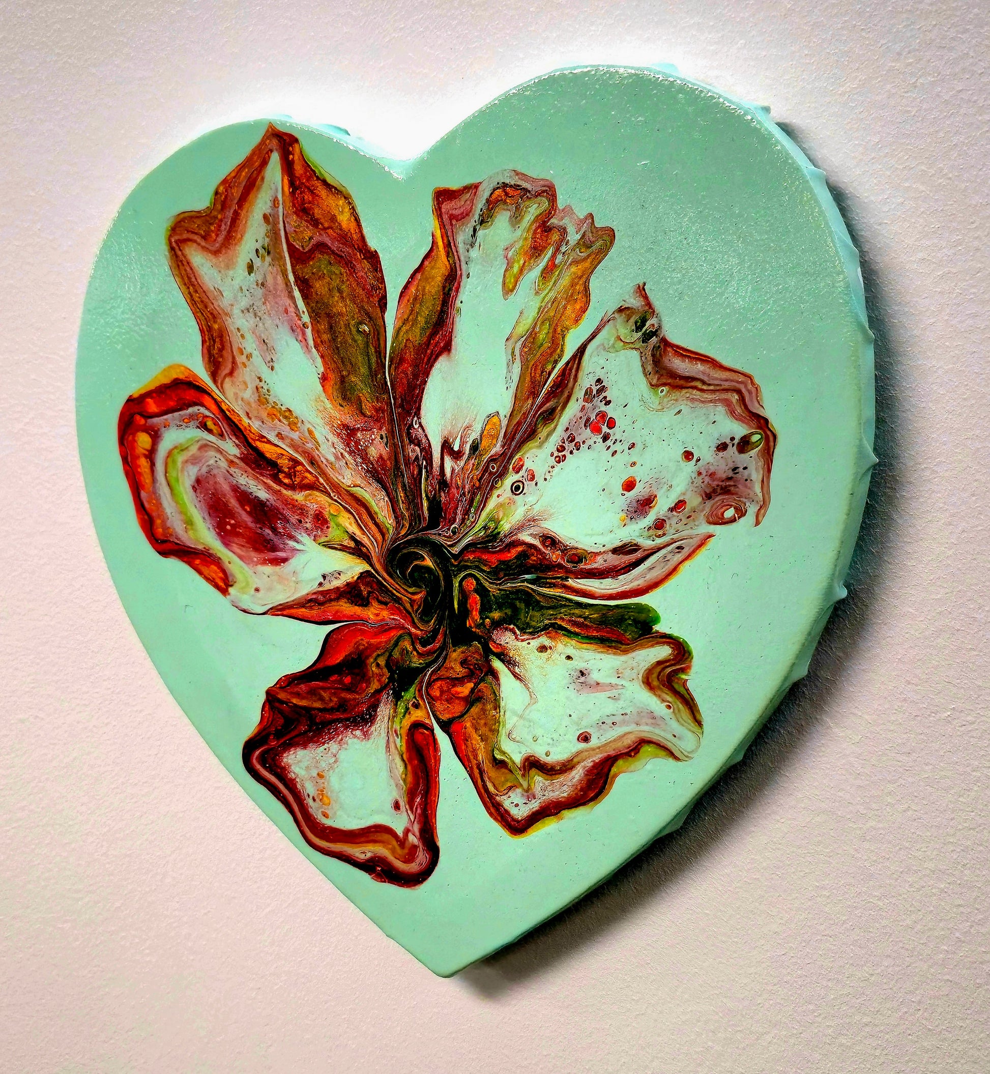 Farby akrylowe swobodnie spływają po płótnie w kształcie serca, tworząc organiczne, kwiatowe formy. Każdy płatek powstał spontanicznie – to efekt procesu twórczego, w którym farby same decydują o swoim kształcie. Kontrast między spokojnym miętowym tłem a dynamicznym centrum tworzy harmonijną całość.