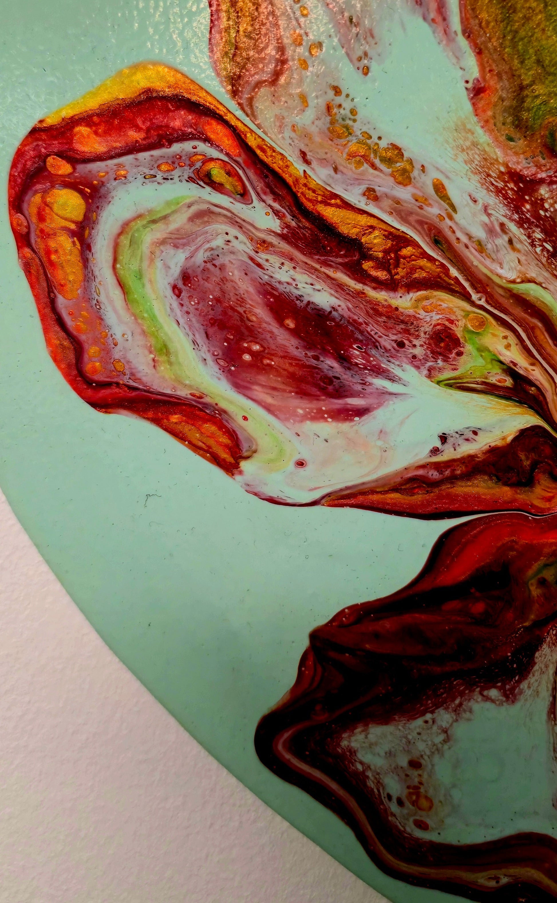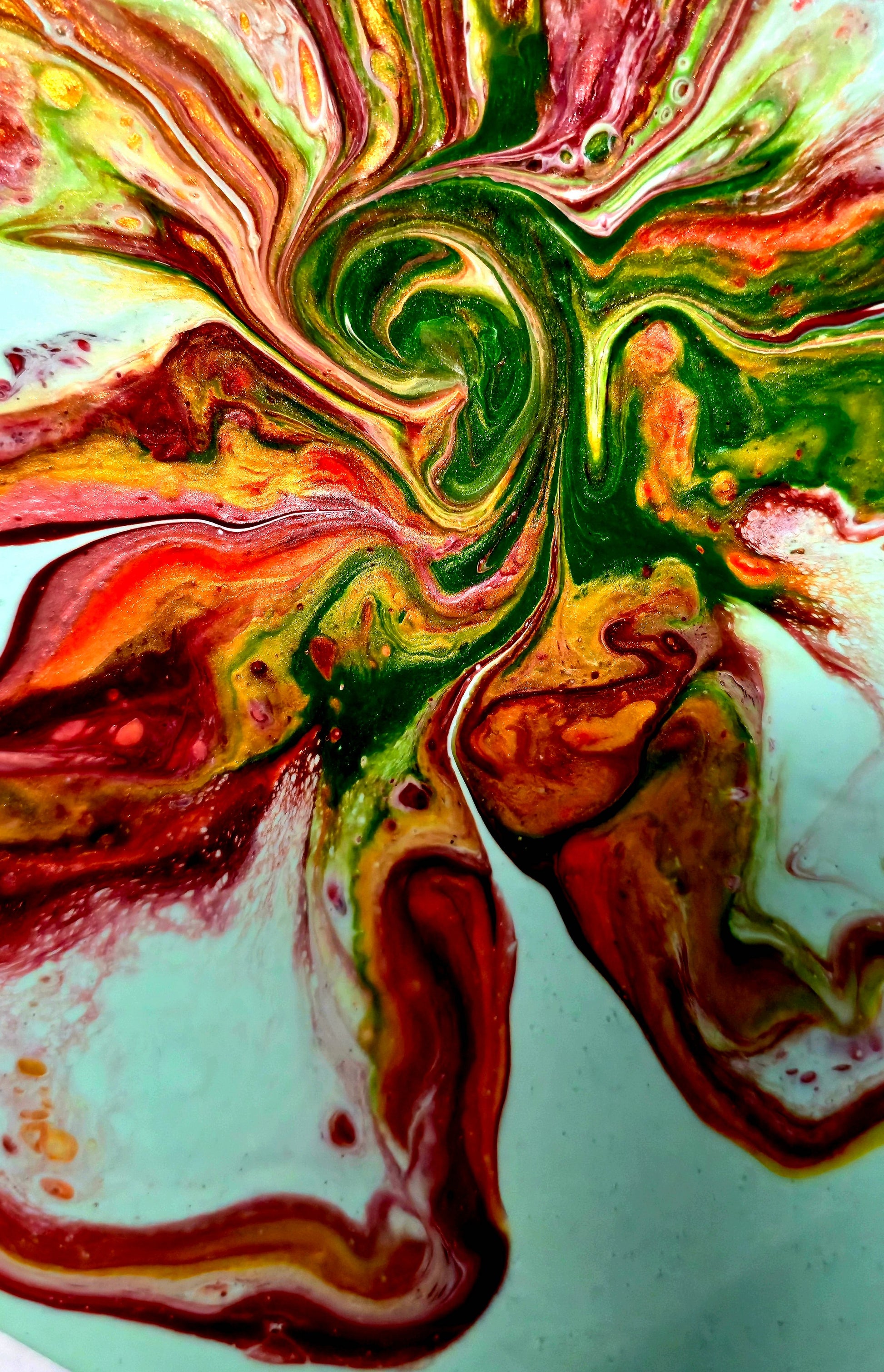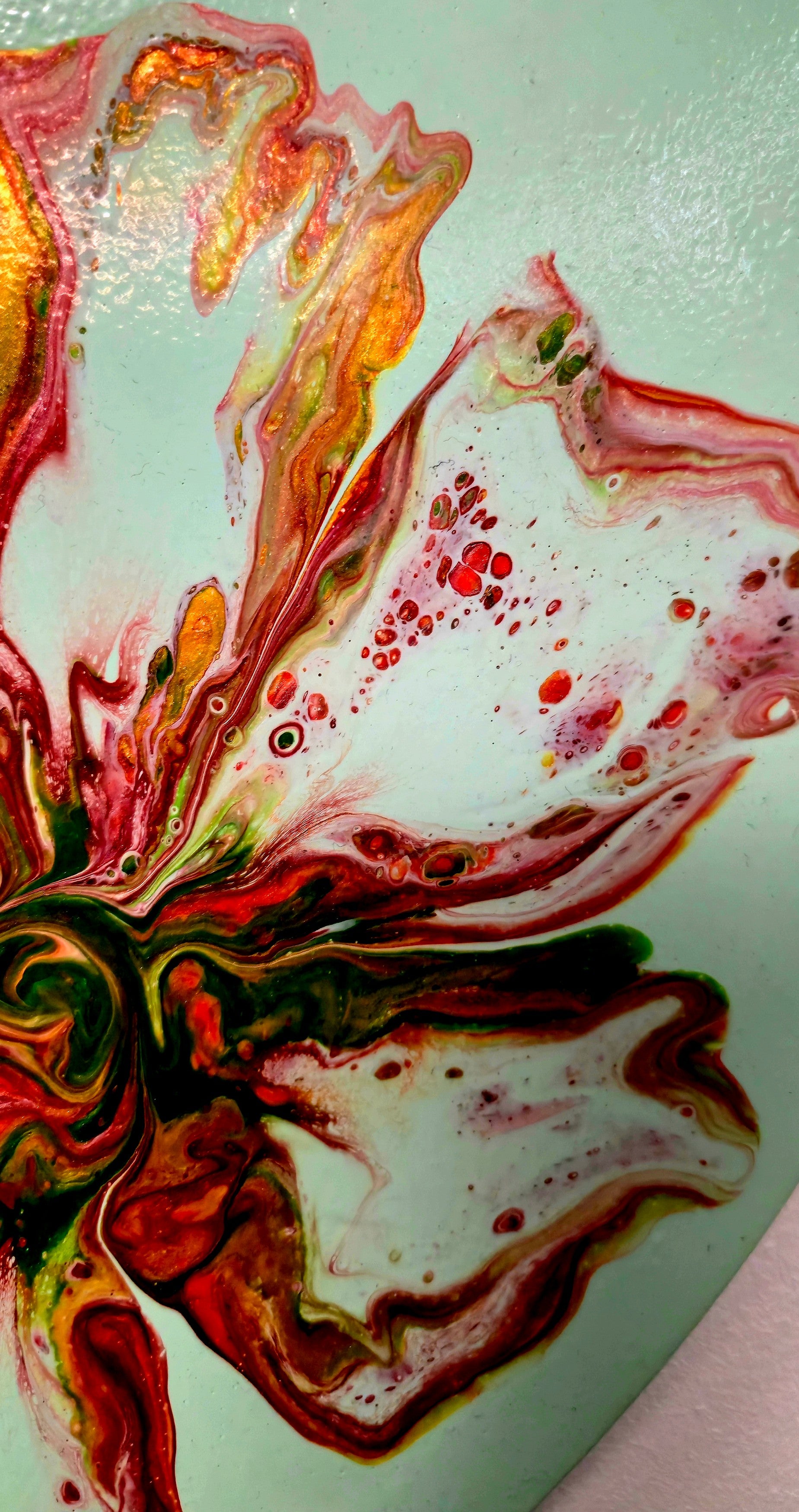 Farby akrylowe swobodnie spływają po płótnie w kształcie serca, tworząc organiczne, kwiatowe formy. Każdy płatek powstał spontanicznie – to efekt procesu twórczego, w którym farby same decydują o swoim kształcie. Kontrast między spokojnym miętowym tłem a dynamicznym centrum tworzy harmonijną całość.