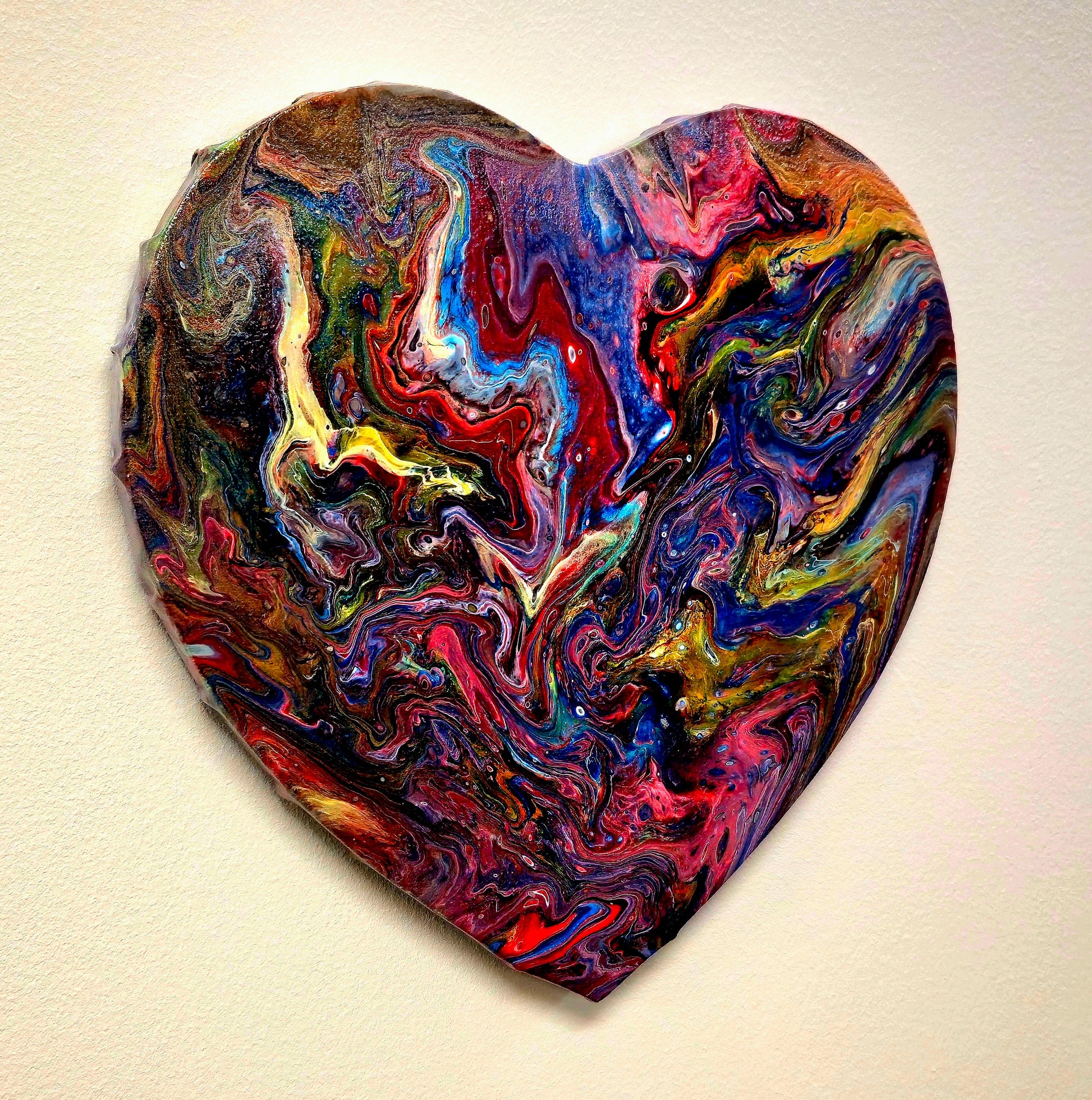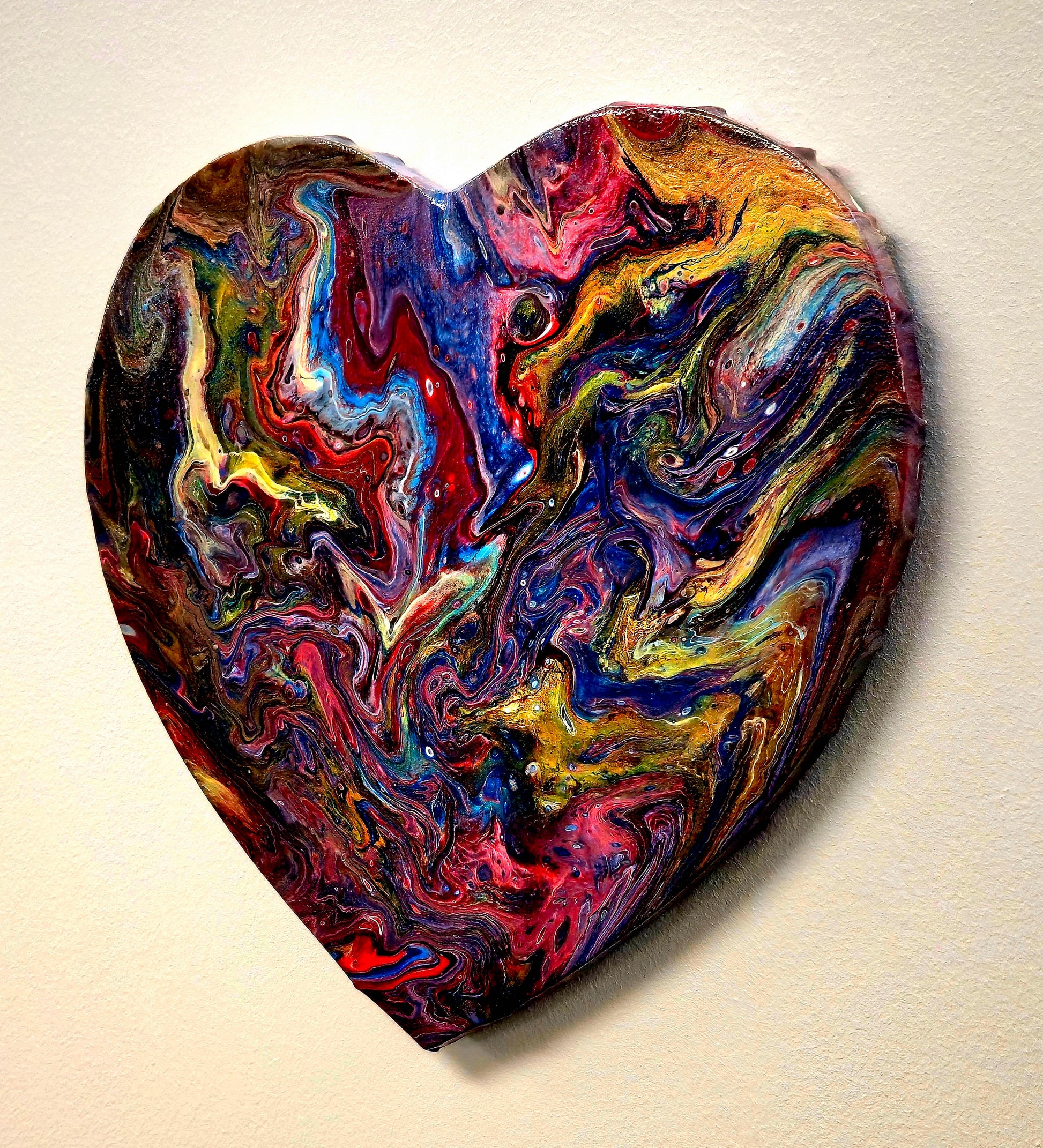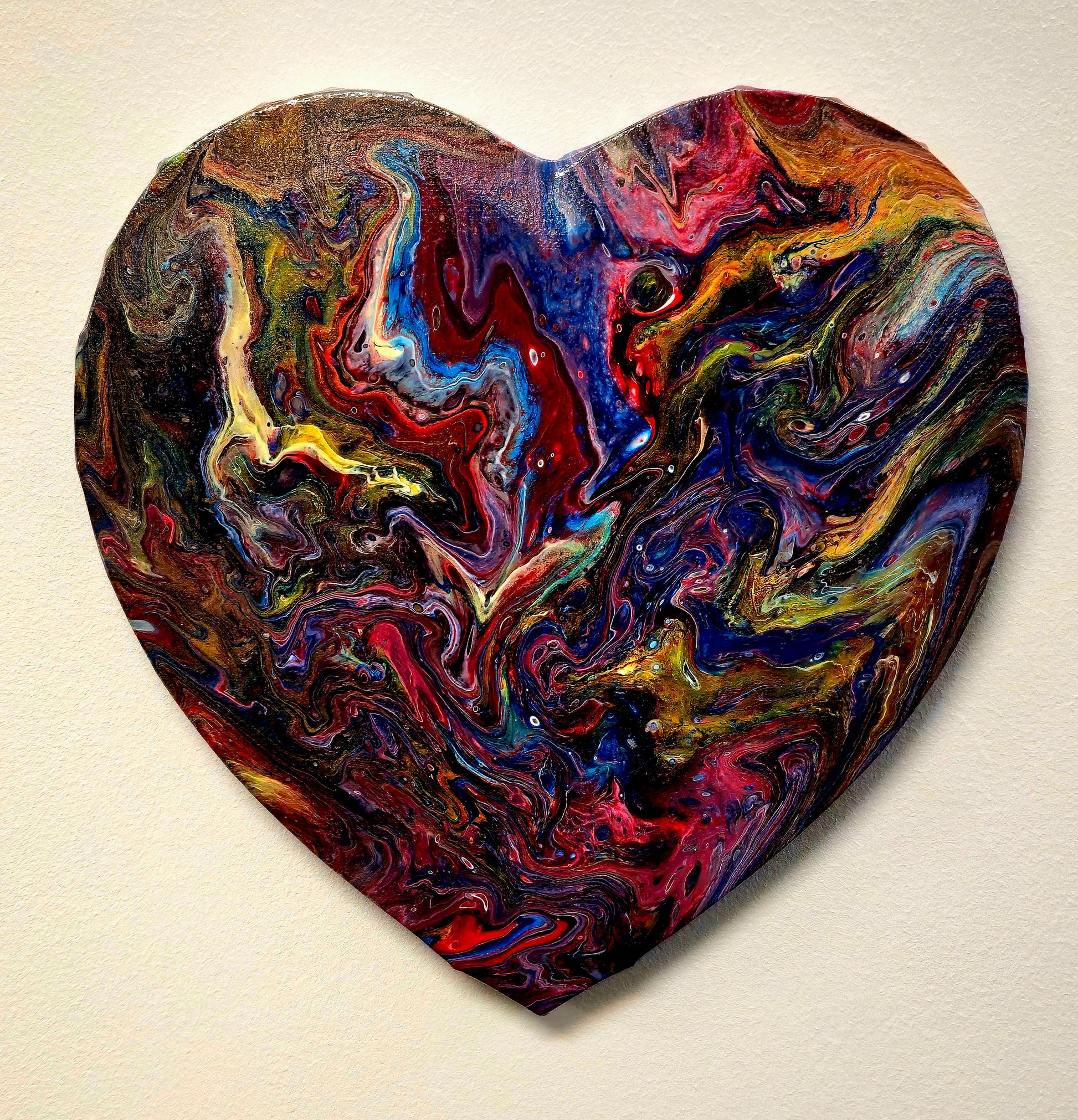 Farby akrylowe swobodnie spływają po płótnie w kształcie serca, tworząc organiczne, niepowtarzalne struktury. Każdy wirujący wzór, każda komórka koloru to efekt spontanicznego procesu twórczego – niemożliwy do odtworzenia, namalowany raz, na zawsze.