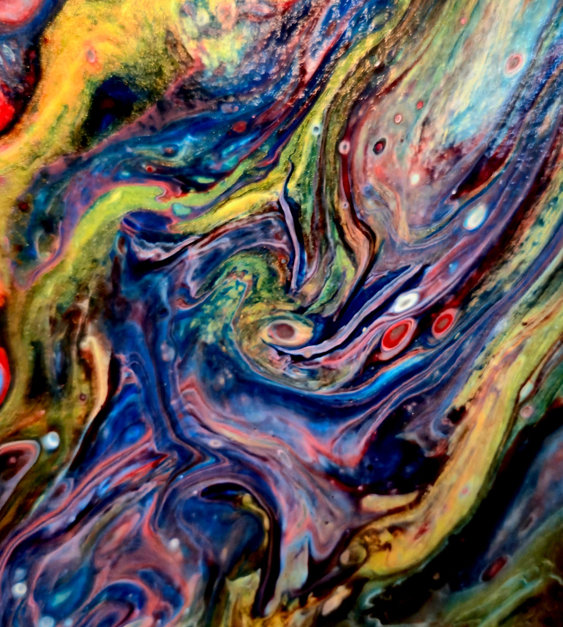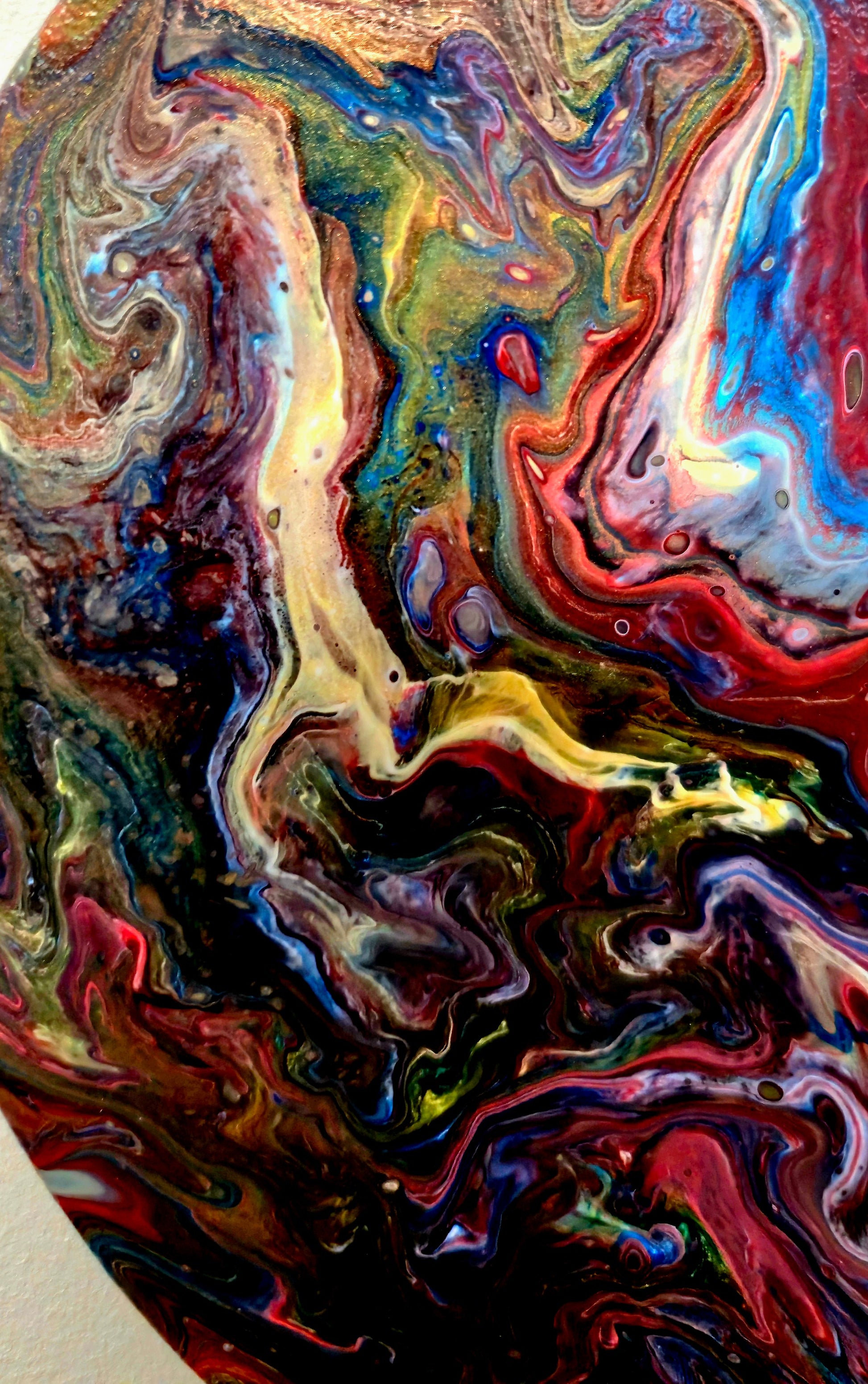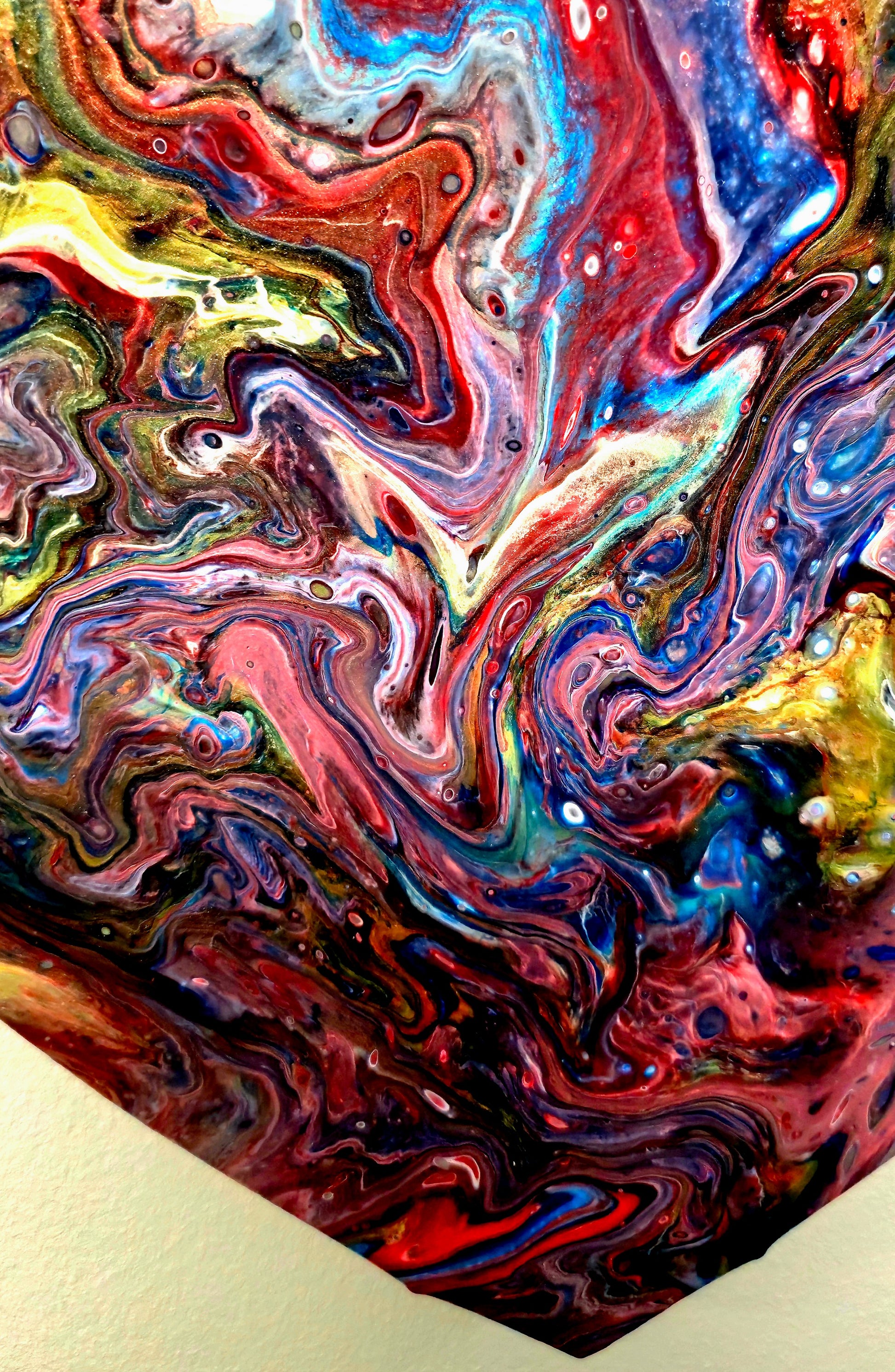 Farby akrylowe swobodnie spływają po płótnie w kształcie serca, tworząc organiczne, niepowtarzalne struktury. Każdy wirujący wzór, każda komórka koloru to efekt spontanicznego procesu twórczego – niemożliwy do odtworzenia, namalowany raz, na zawsze.