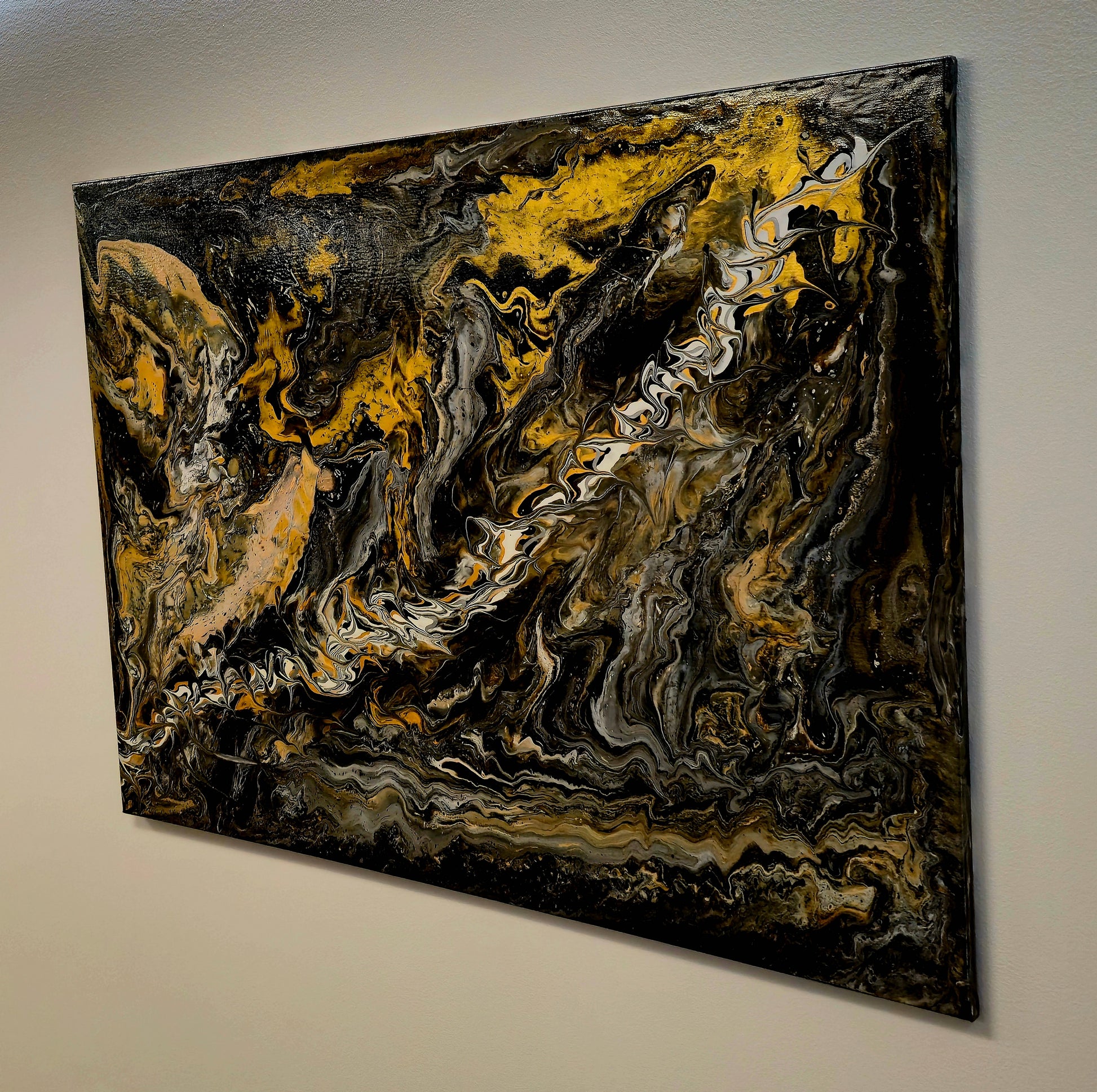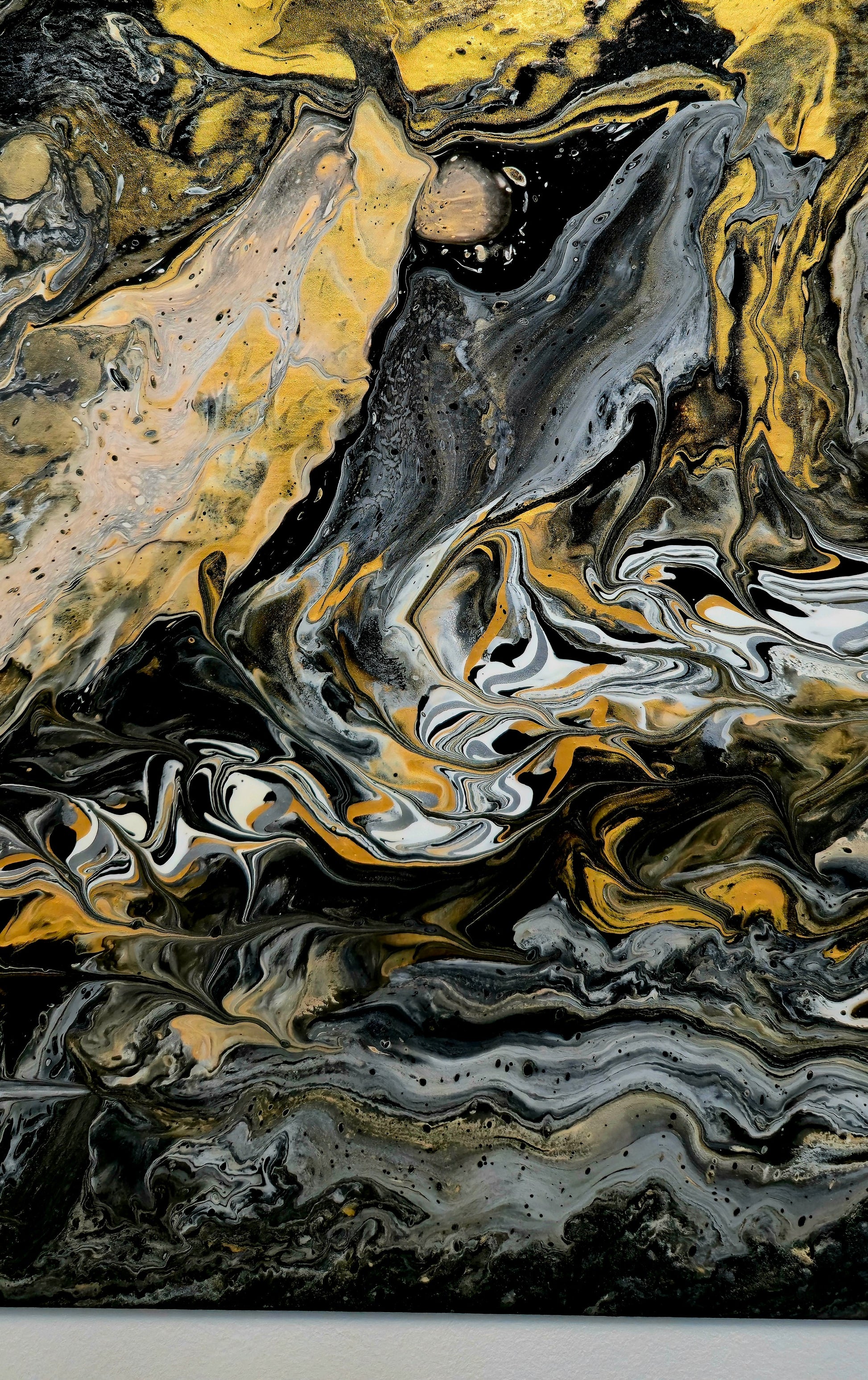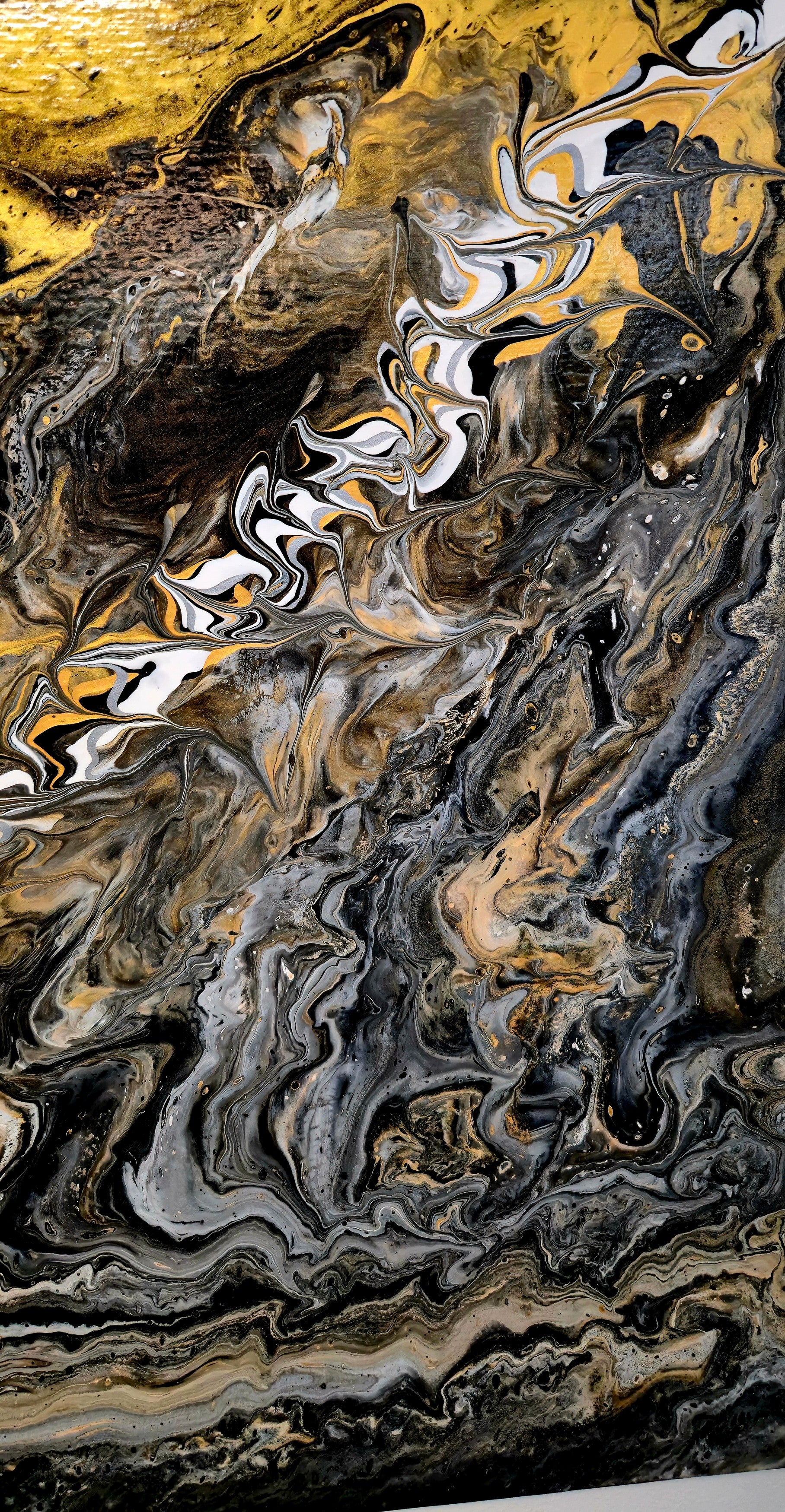 Technika Pouring Art pozwoliła farbom samodzielnie stworzyć niepowtarzalną kompozycję – żadne dwa obrazy nigdy nie będą identyczne. Złote akcenty odbijają światło, zmieniając charakter dzieła w zależności od pory dnia. Kontrast między ciemnością a blaskiem budzi emocje i dodaje wnętrzu głębi.