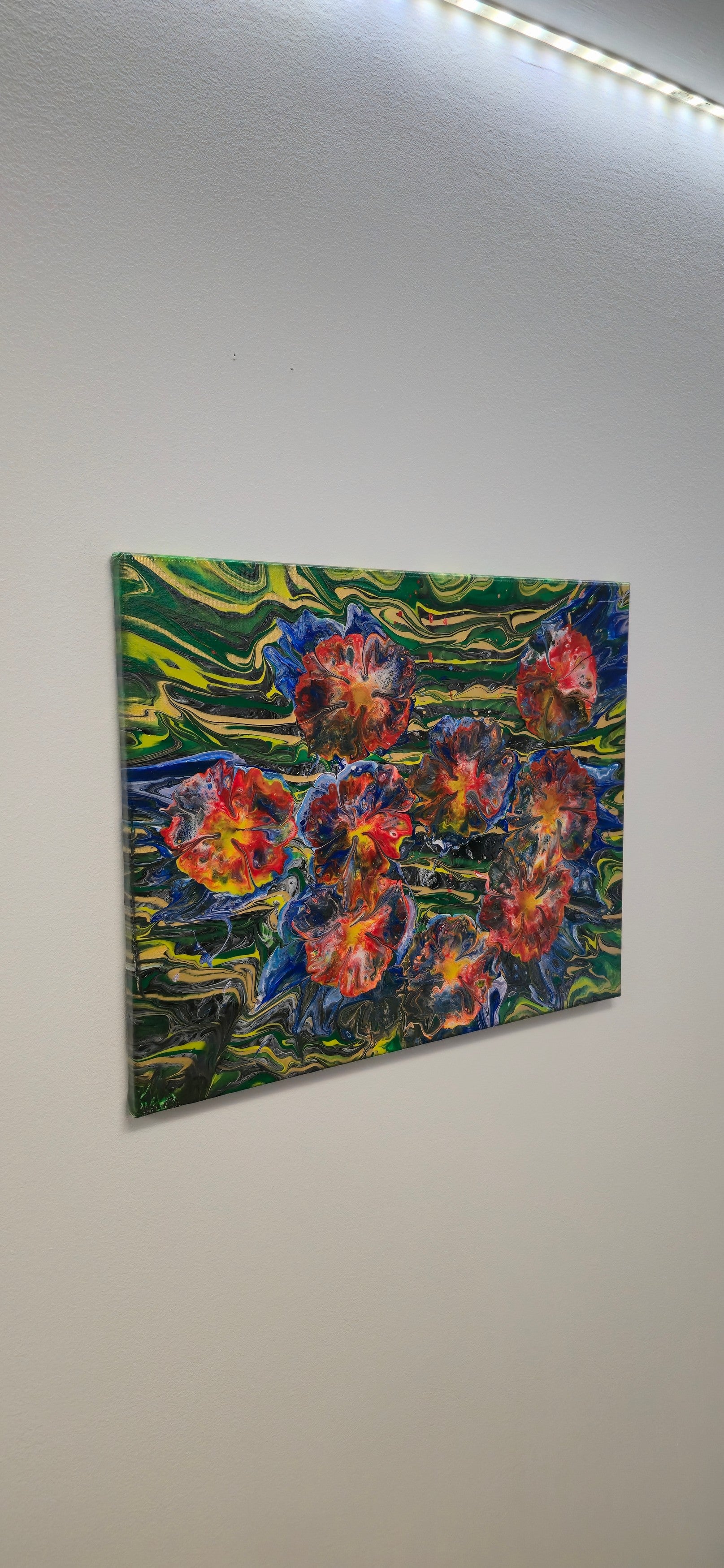 To dzieło powstało jako celebracja życia w pełnym kolorze. Na tle wirujących zieleni, błękitów i żółci Emil namalował osiem wielkich kwiatów – każdy inny, każdy pulsujący czerwienią, pomarańczem, fioletem i żółcią. Farby płyną jak fale oceanu, niosąc kwiaty w wiecznym tańcu. Każdy płatek został stworzony przez samą naturę farb – technika Pouring Art pozwoliła im żyć własnym życiem, tworząc organiczne, niepowtarzalne formy.