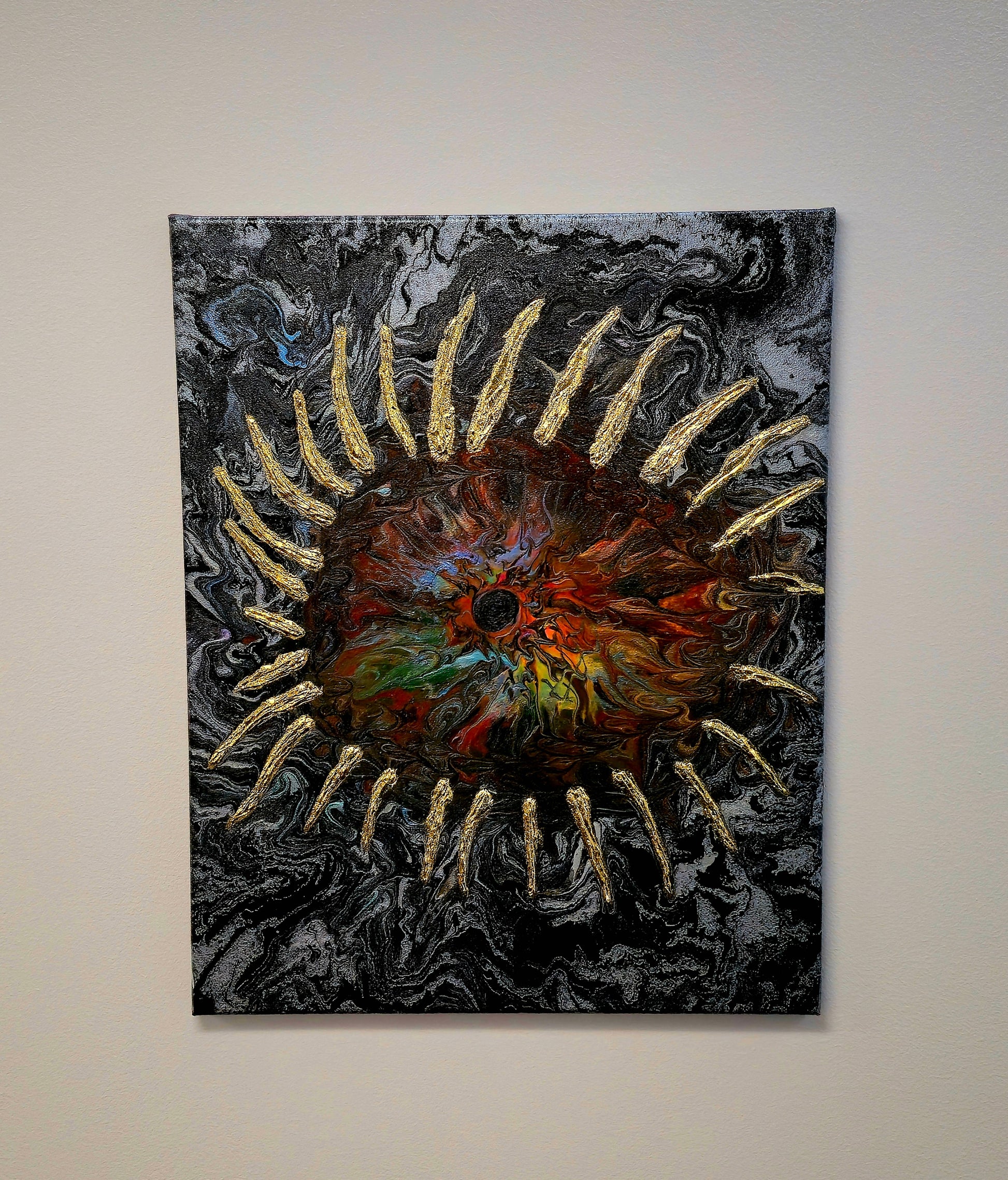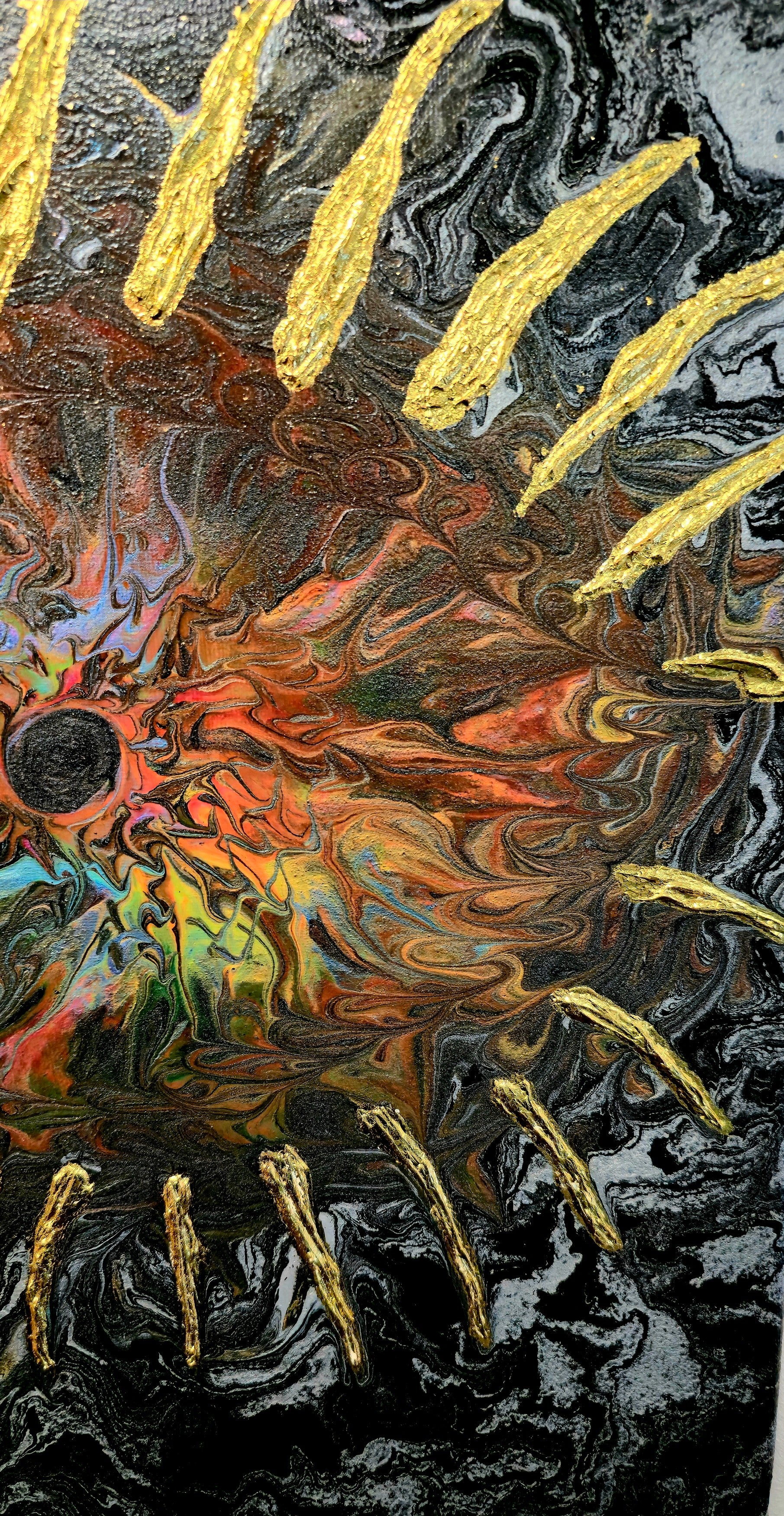 Połączenie dynamicznej techniki Pouring Art z precyzyjnie namalowanymi złotymi promieniami tworzy hipnotyzującą mandalę energii. Każdy kolor symbolizuje inną emocję, każdy promień to ścieżka światła prowadząca do centrum. Czarne oko w środku to punkt spokoju – świadoma obecność pośród chaosu. Format 40x50 cm sprawia, że dzieło staje się medytacyjnym punktem w każdym wnętrzu.