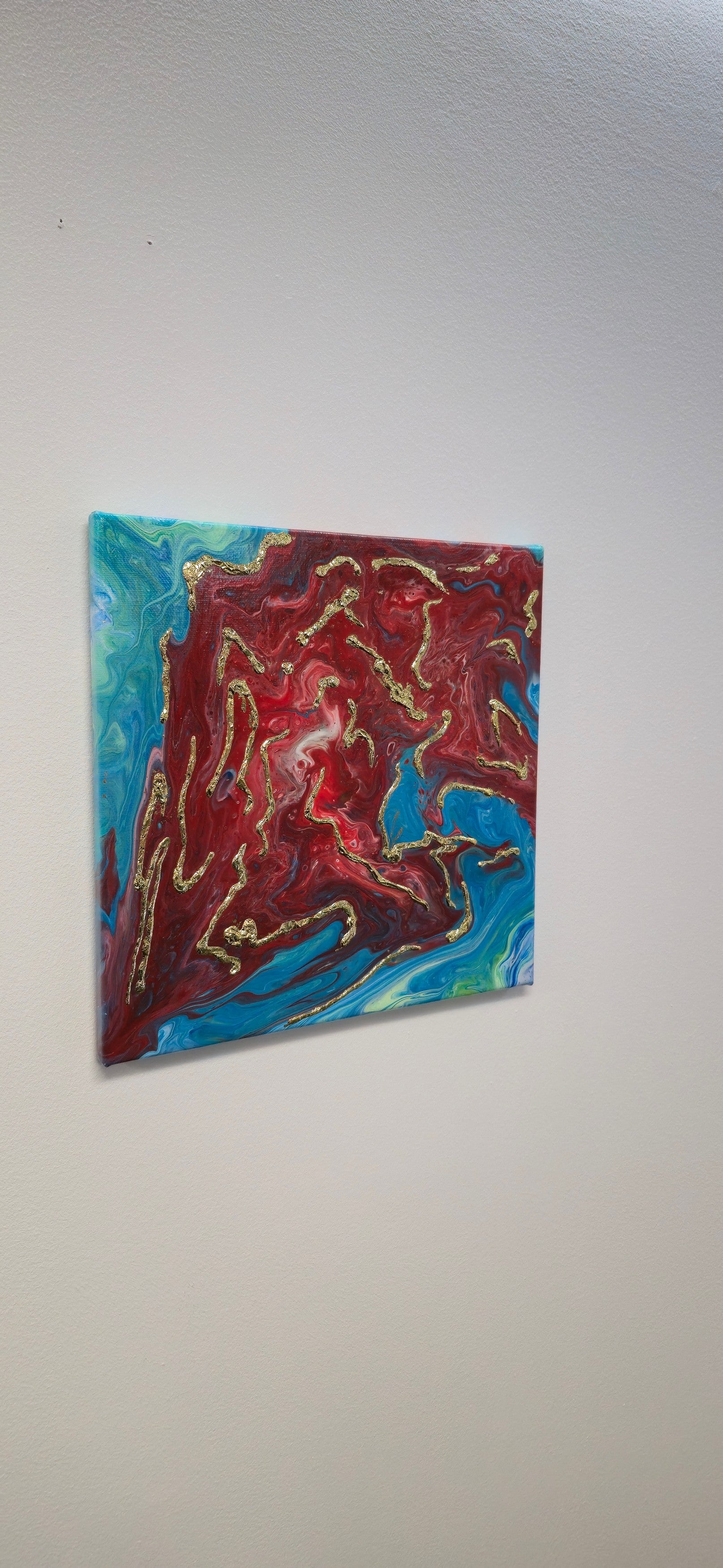 Połączenie dynamicznej techniki Pouring Art z precyzyjnie namalowanymi złotymi żyłami tworzy kompozycję pełną symboliki i emocji. Intensywna czerwień symbolizuje polską krew i pasję, złote żyły to siła ducha i dziedzictwo, turkusowe wiry to wolność i nadzieja. Każda linia została namalowana ręcznie z głębokim szacunkiem dla historii. Format 30x30 cm sprawia, że dzieło idealnie wpisuje się w każde wnętrze jako symbol tożsamości i dumy.