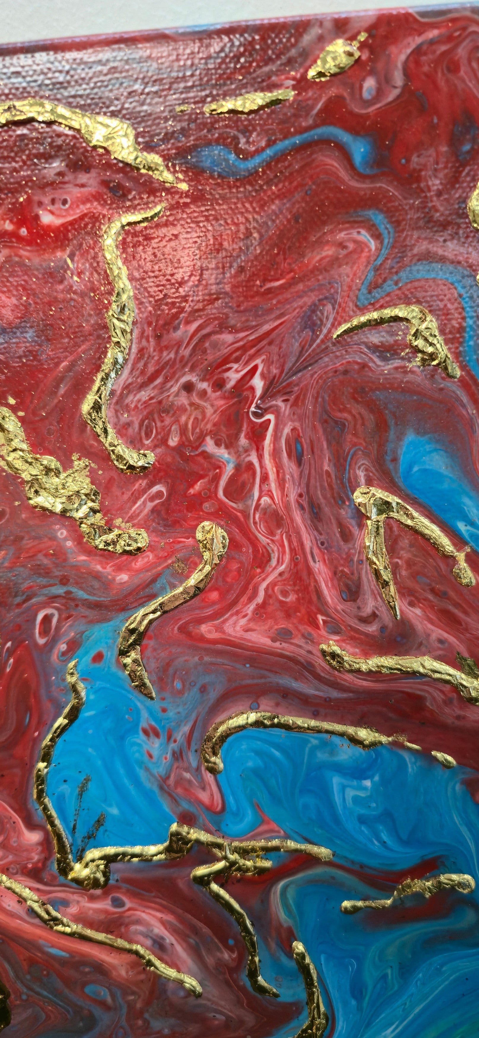 To dzieło powstało jako hołd dla polskiej tożsamości i dumy. Na tle intensywnej, głębokiej czerwieni Emil namalował złote żyły – jak szlaki krwi, jak ścieżki historii, jak linie życia narodu, który zawsze znajdował siłę, by powstać. Turkusowe wiry na brzegach to oddech wolności, każda złota linia to opowieść o wytrwałości. Farby wirują i pulsują, tworząc żywą, organiczną kompozycję pełną energii i dumy.