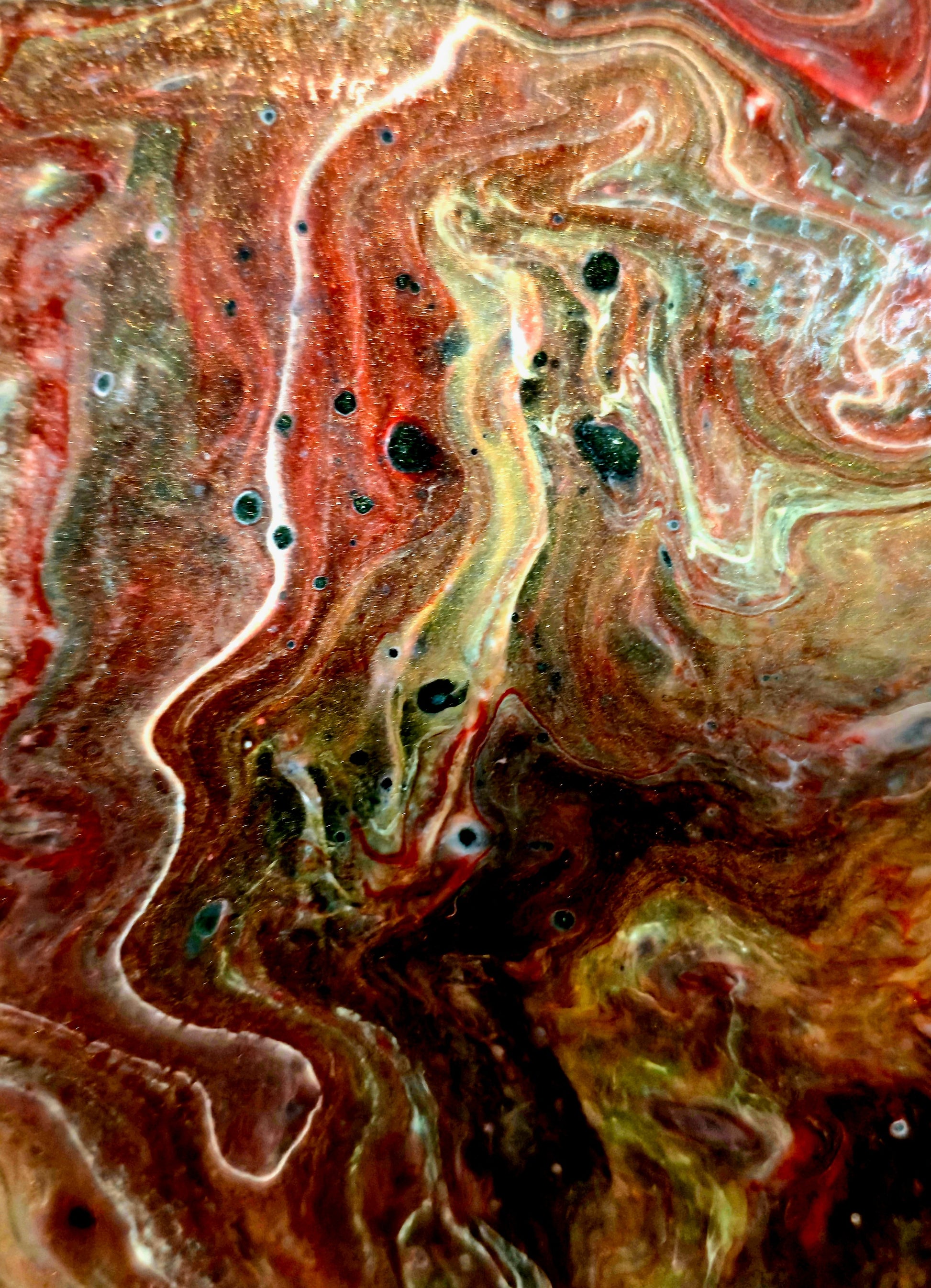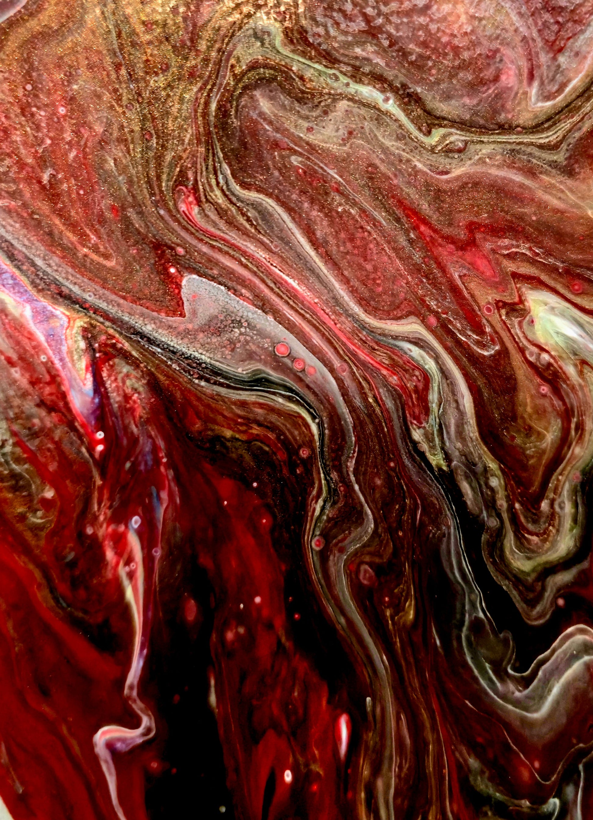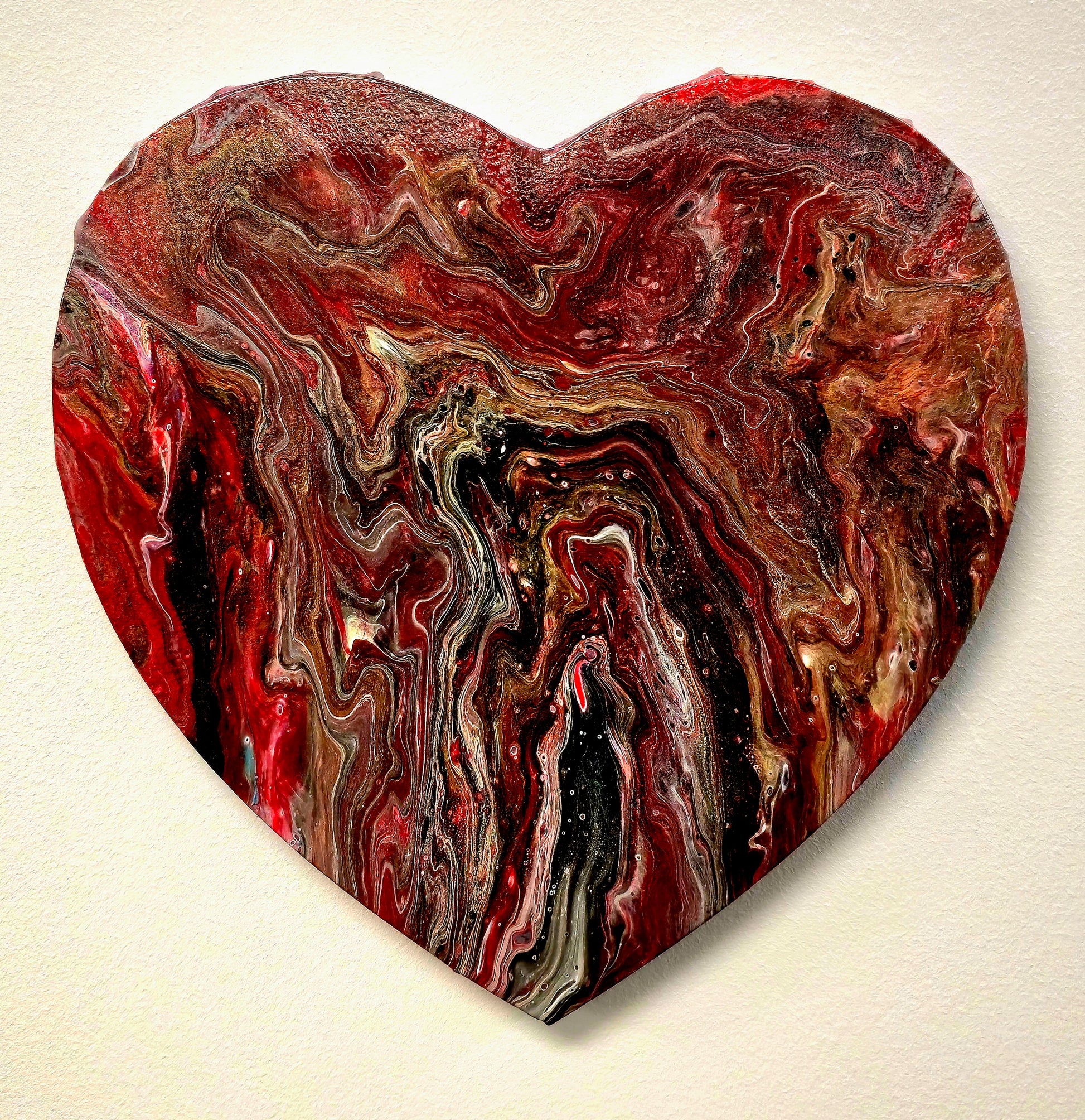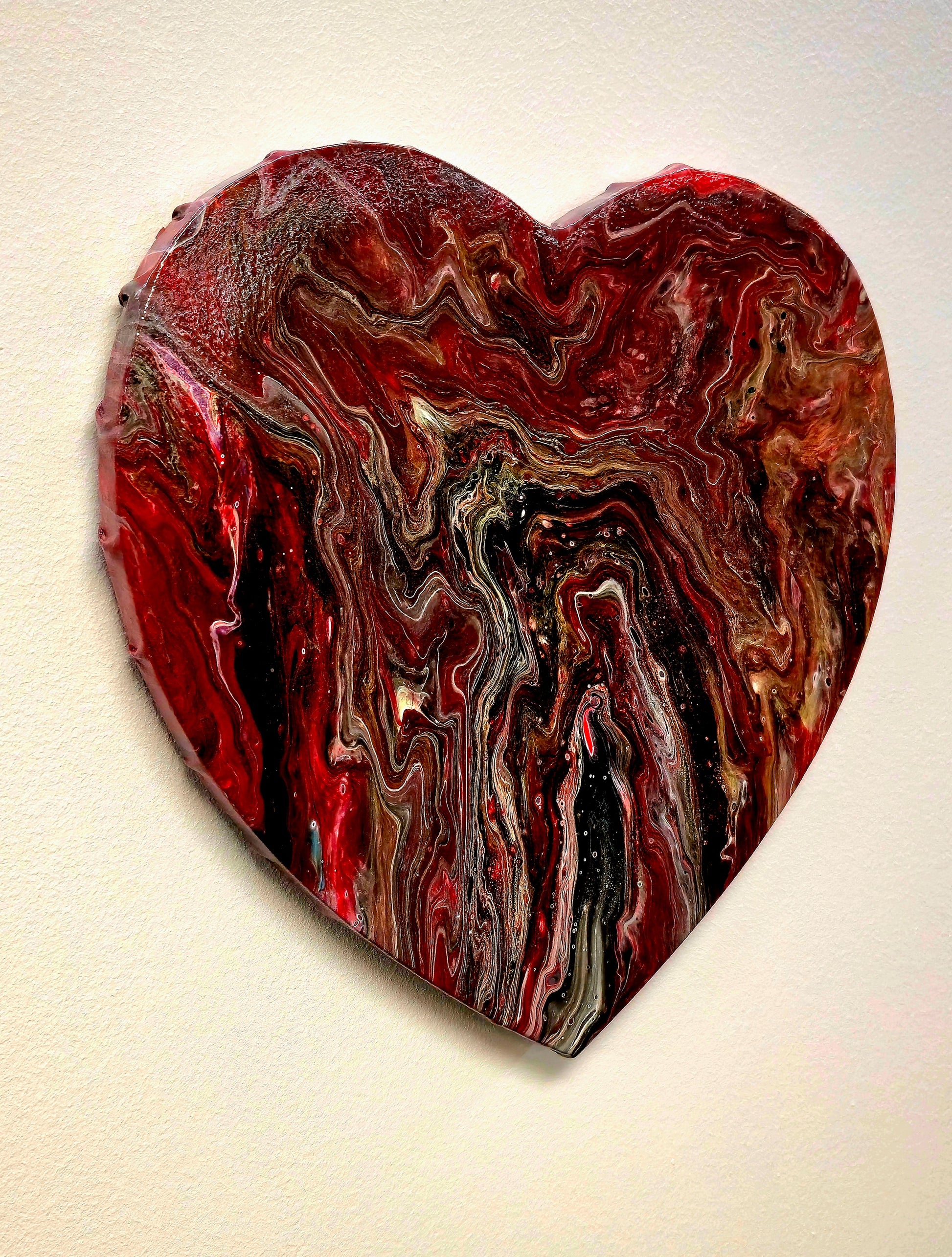 Farby akrylowe swobodnie spływają po płótnie w kształcie serca, tworząc organiczne, marmurowe struktury. Każdy wirujący wzór, każda komórka koloru powstała spontanicznie – to efekt procesu twórczego, którego nie da się zaplanować ani powtórzyć. Intensywny połysk farb podkreśla głębię kolorów.